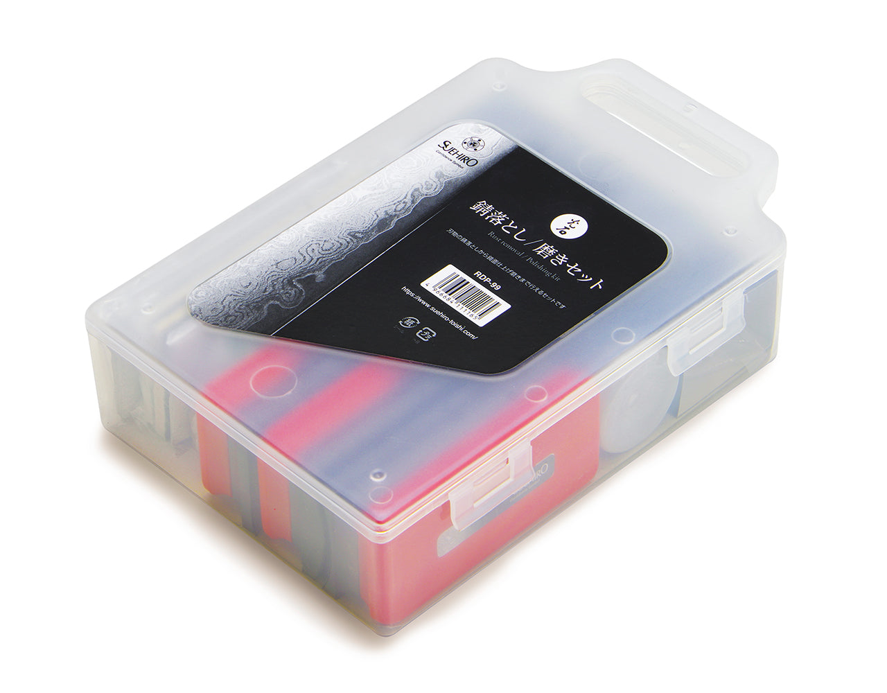This set of tools and abrasives can remove rust and polish for a mirror finish. The set includes water-resistant paper and ultra-fine abrasives for a beautiful finish. After removing rust and stain with a rust-removing eraser and a water-resistant paper and then polishing with ultrafine particle abrasives and green rouge abrasives, the surface will be gloss and ready for clean use. Furthermore, sharpening with a whetstone will revive the sharpness of tools.